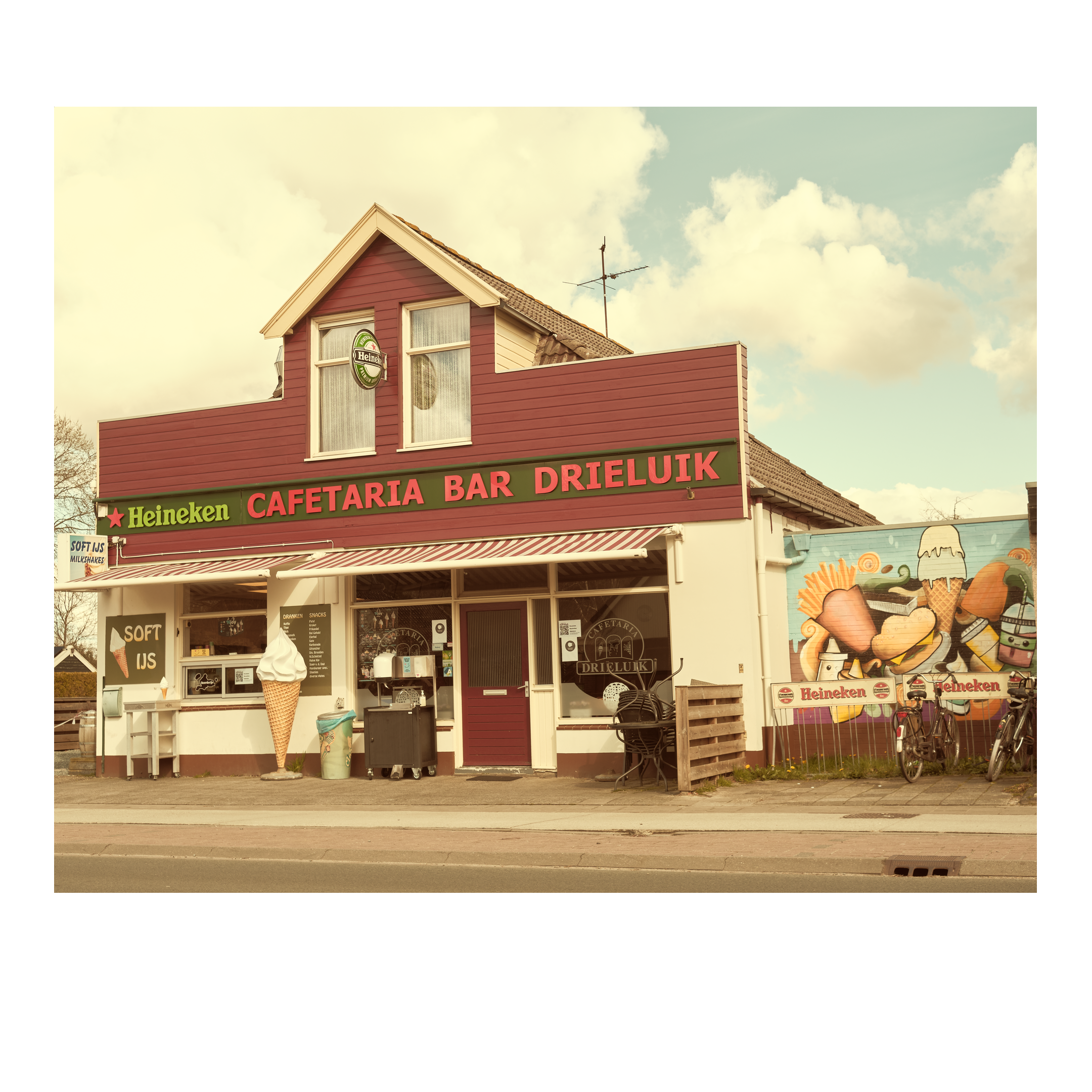 Sommige beelden en plaatsen komen bekend voor, alsof je ze herinnert zonder zonder er ooit geweest te zijn. Een vishandel op het parkeerterrein achter de Albert Heijn, een boerderij aan de dorpsrand en een snackbar cafetaria Drieluik. Je lijkt ze altijd tegen te komen wanneer je buiten de stad gaat fietsen. Genomen in Paterswolde-Eelde.