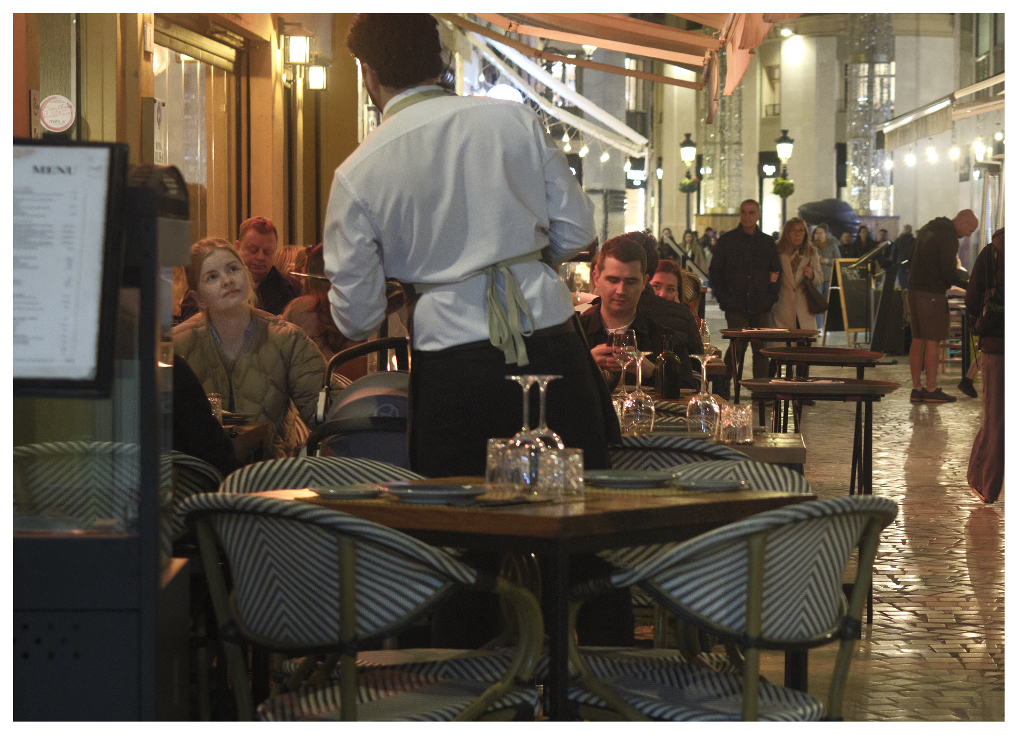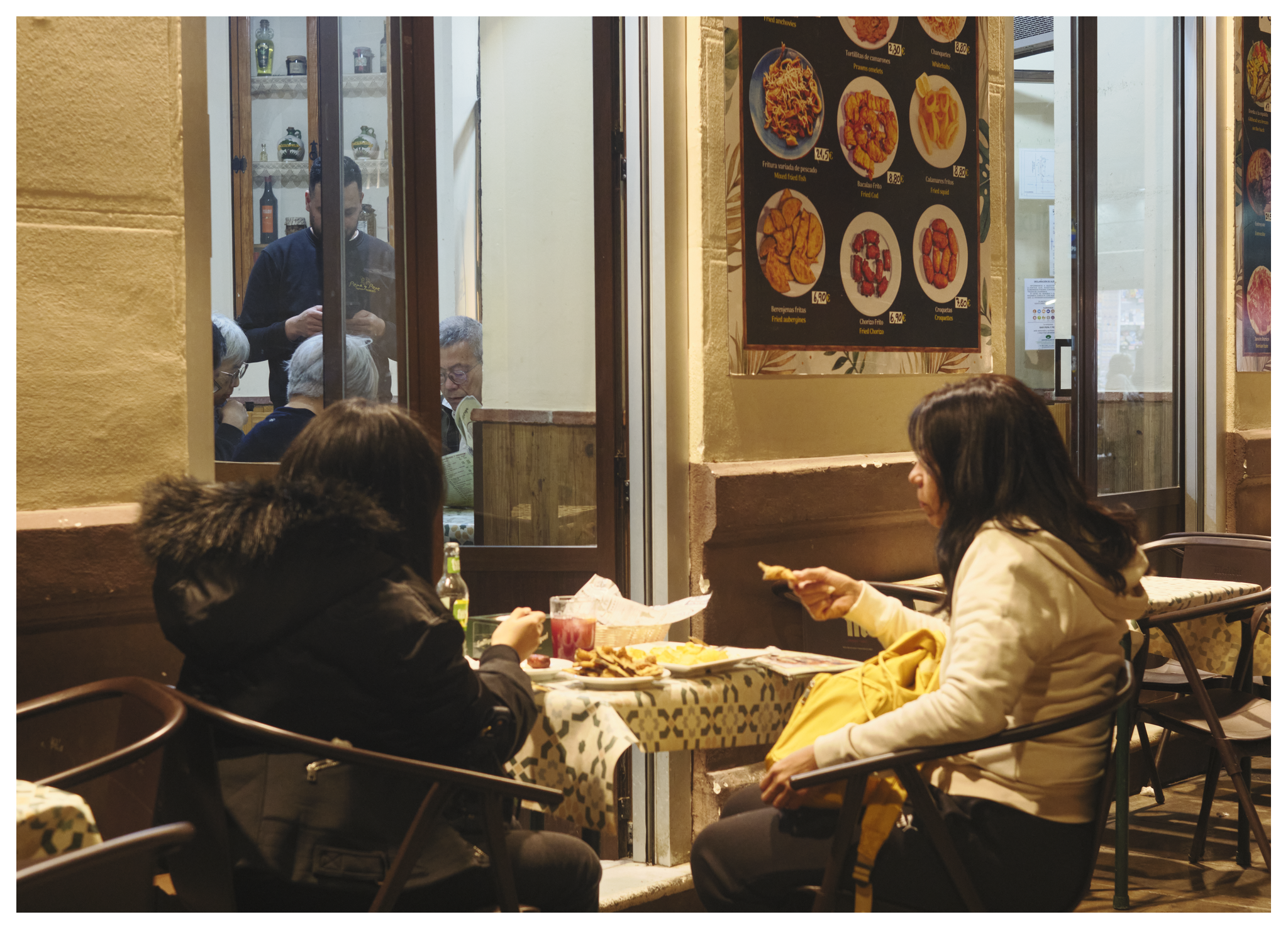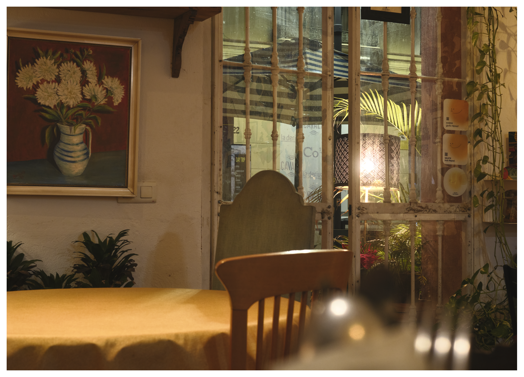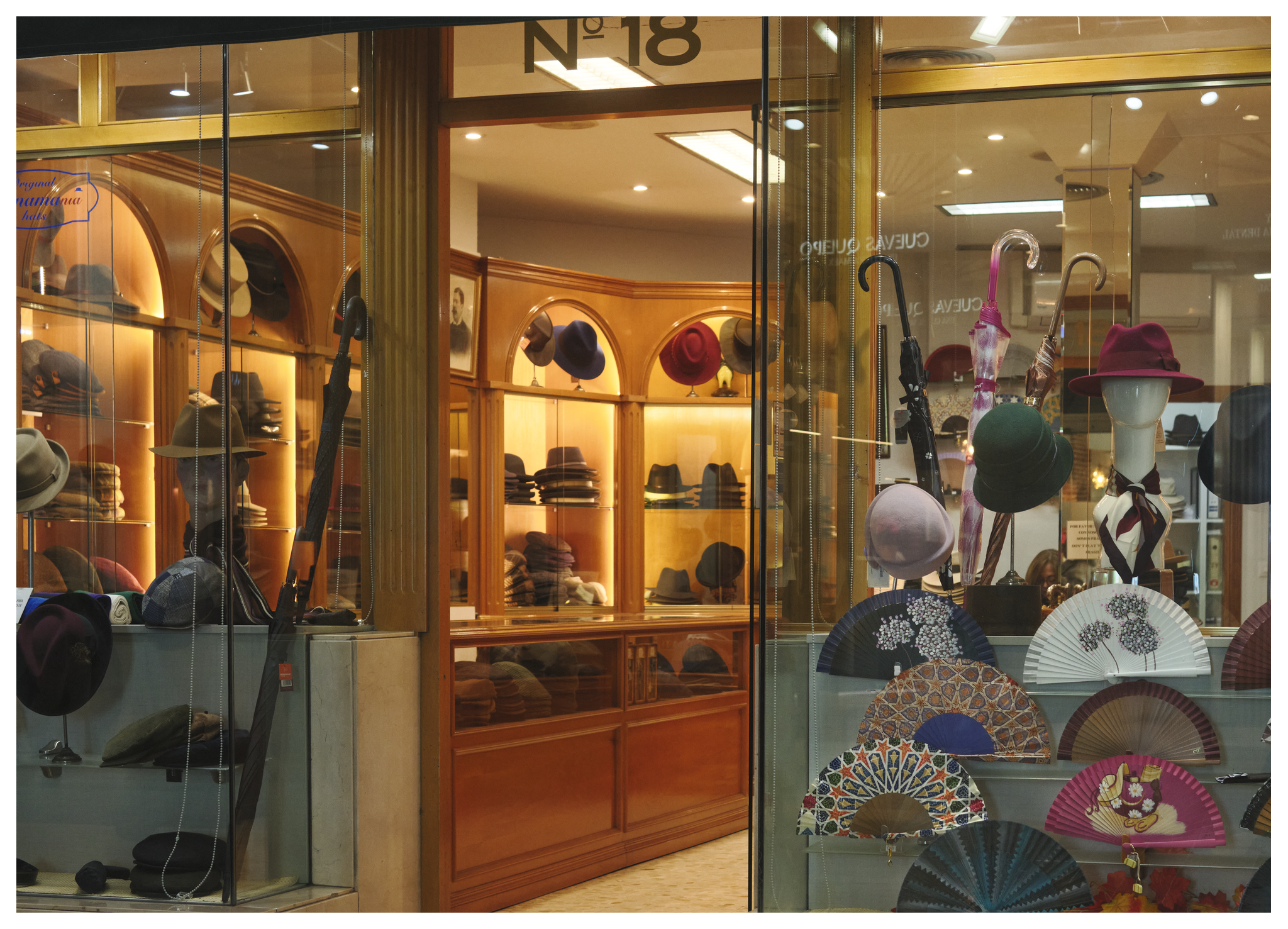 Inkijkjes in het restaurant Mamuchi, een hoedenwinkel, een gebak en ijswinkel en twee kleurige jurken in een etalage