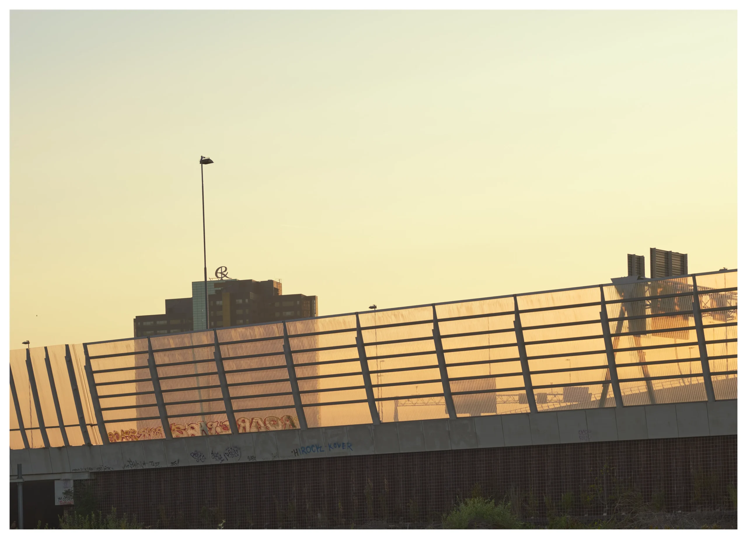 Fietsend rondom Amsterdam kom je al gauw langs de rafelranden tegen van de stad. In de late herfst zon de vuilverbrandings centrale, het belastingkantoor met een voorbij razende trein, kantoorpanden waarschijnlijk leeg vanwege Corona.