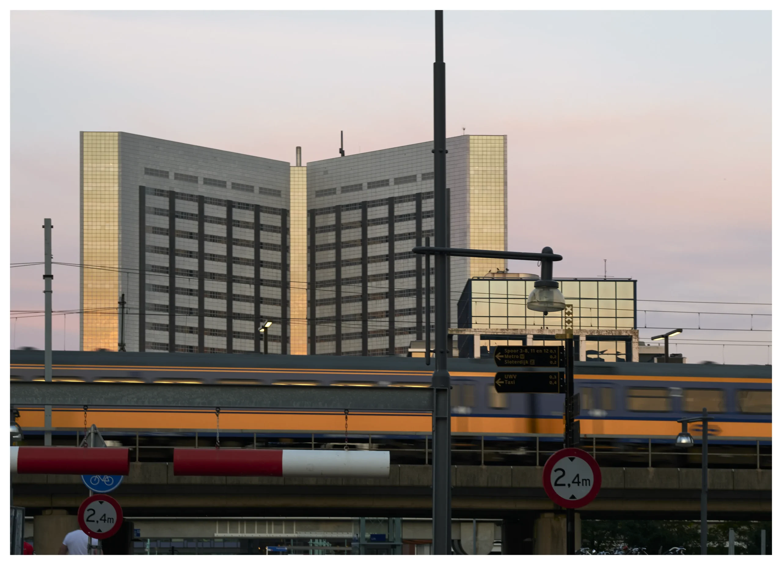 Zonsondergang rondom het Westerpark in Amsterdam, Radion Hotel achter de A10. Enorme tag van Benet daarachter het Ibis Hotel. Spoorlijnen bij het het tunneltje aan de rand van het Westerpark, er rijdt net een trein voorbij