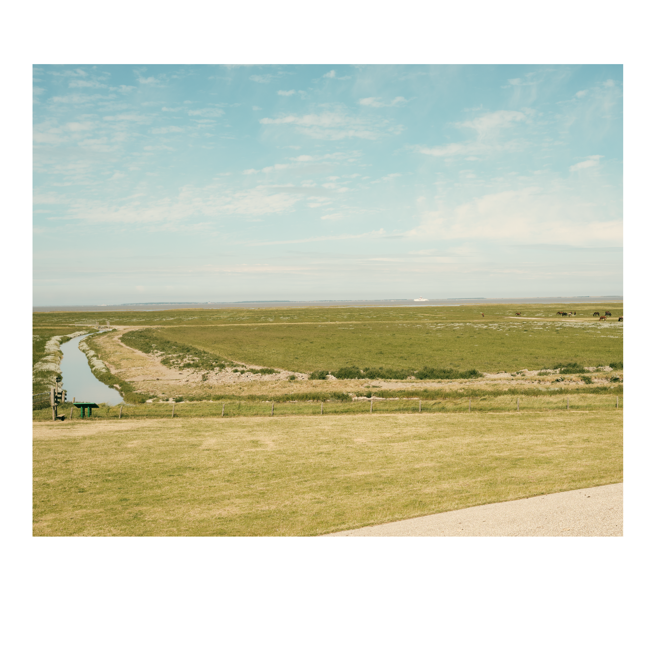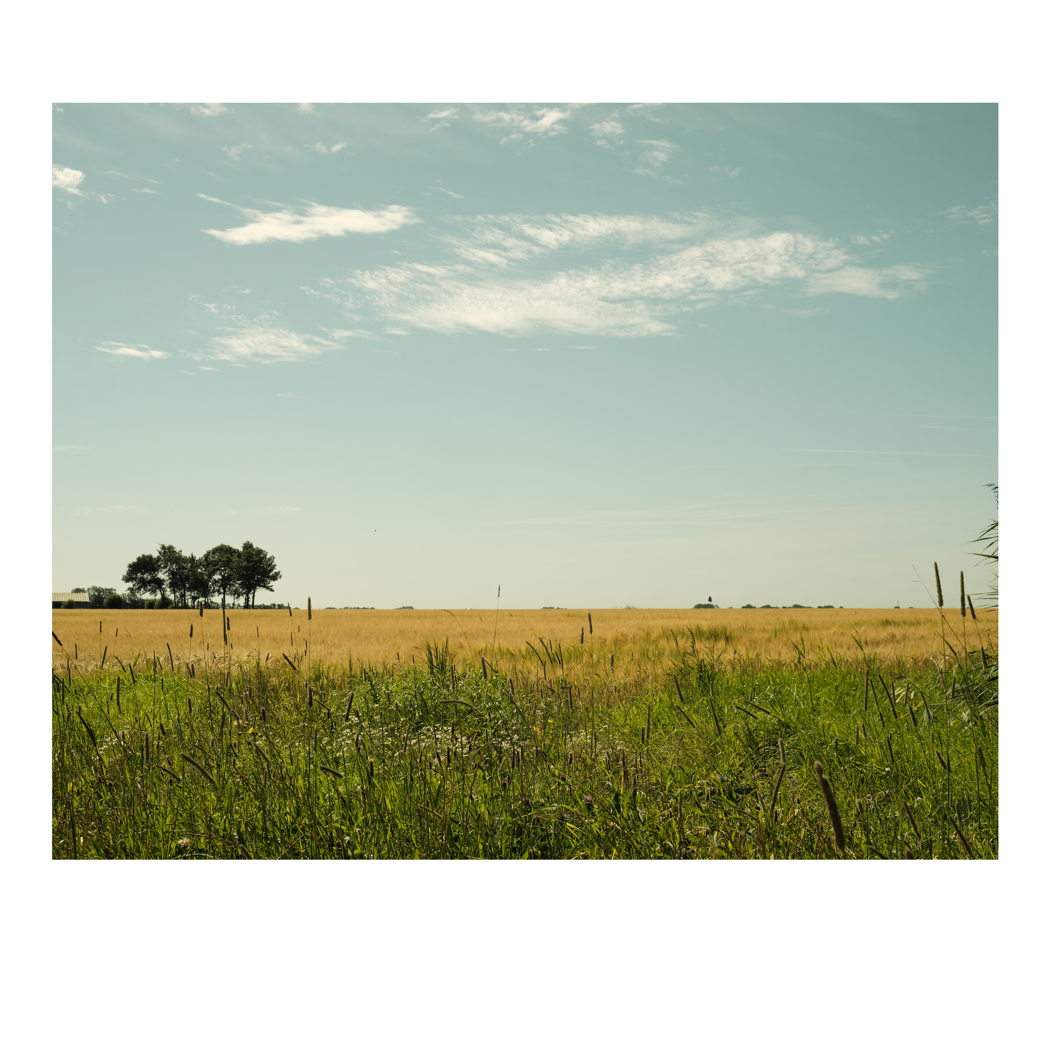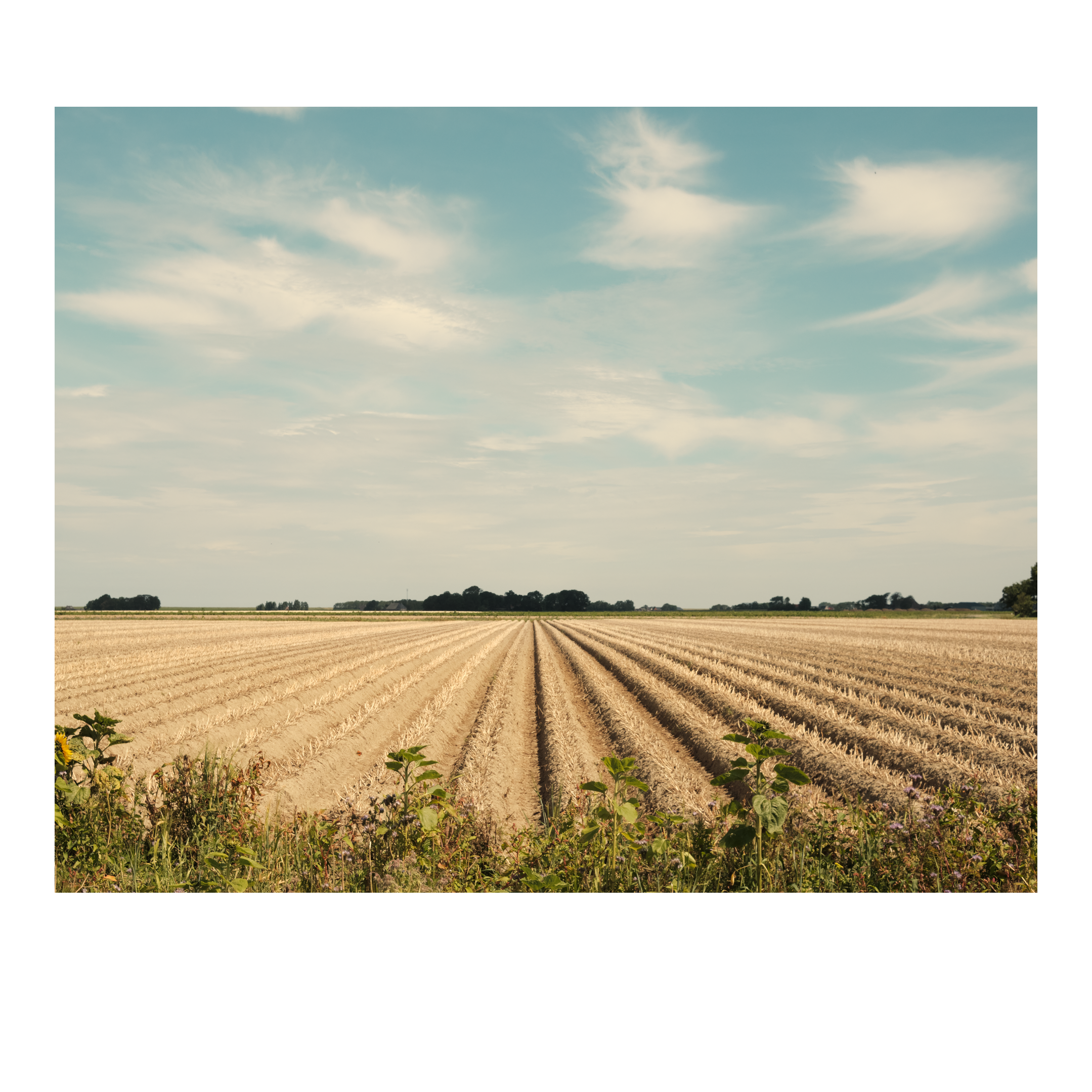 Uitzicht vanaf een dijk over een weiland met grazende paarden, nog verder weg in de verte ligt de zee en de Waddeneilanden. Lege rijen in een geoogst veld. Een veld met graan in de zomer, een boom in de verte, in de randstad kennen we deze leegte niet.