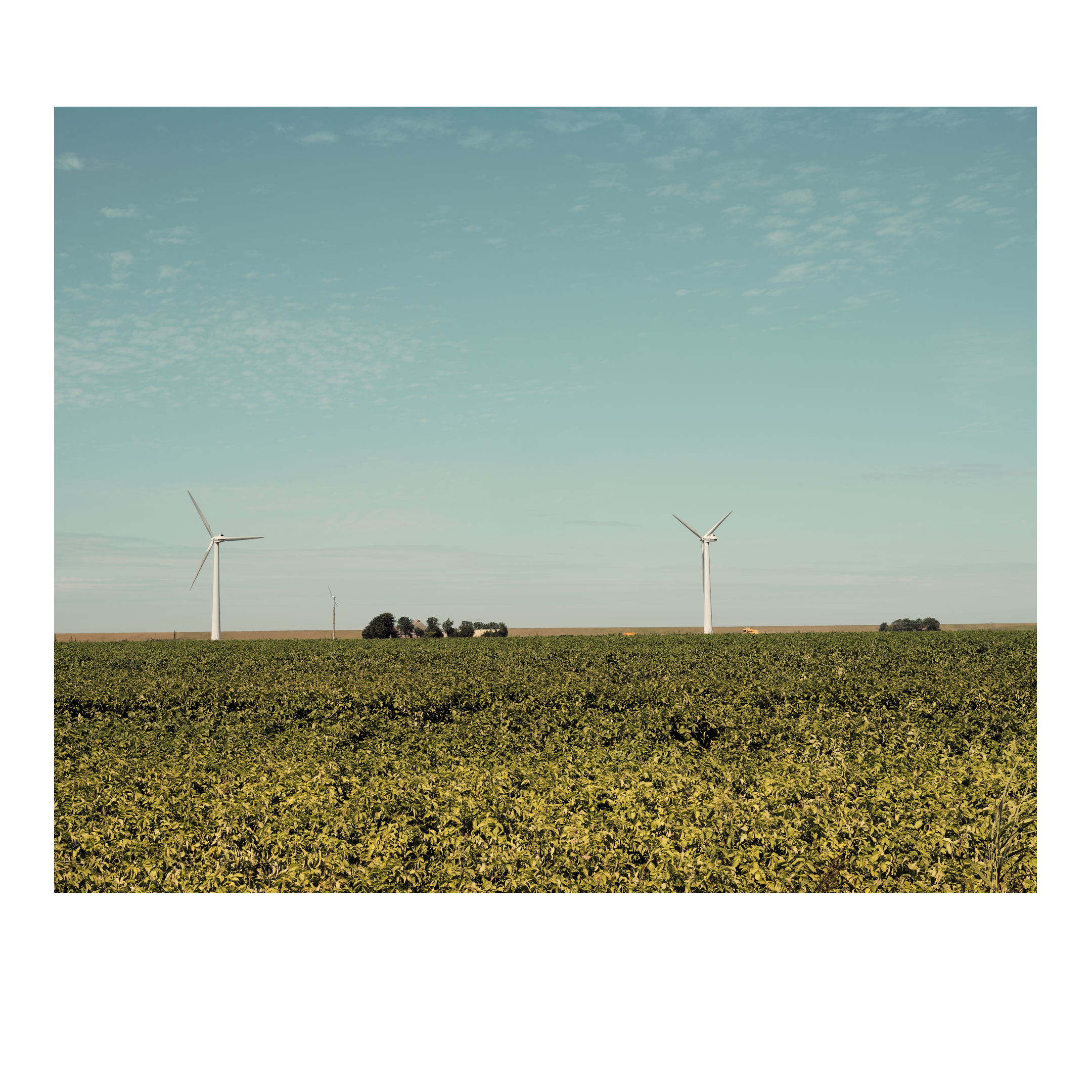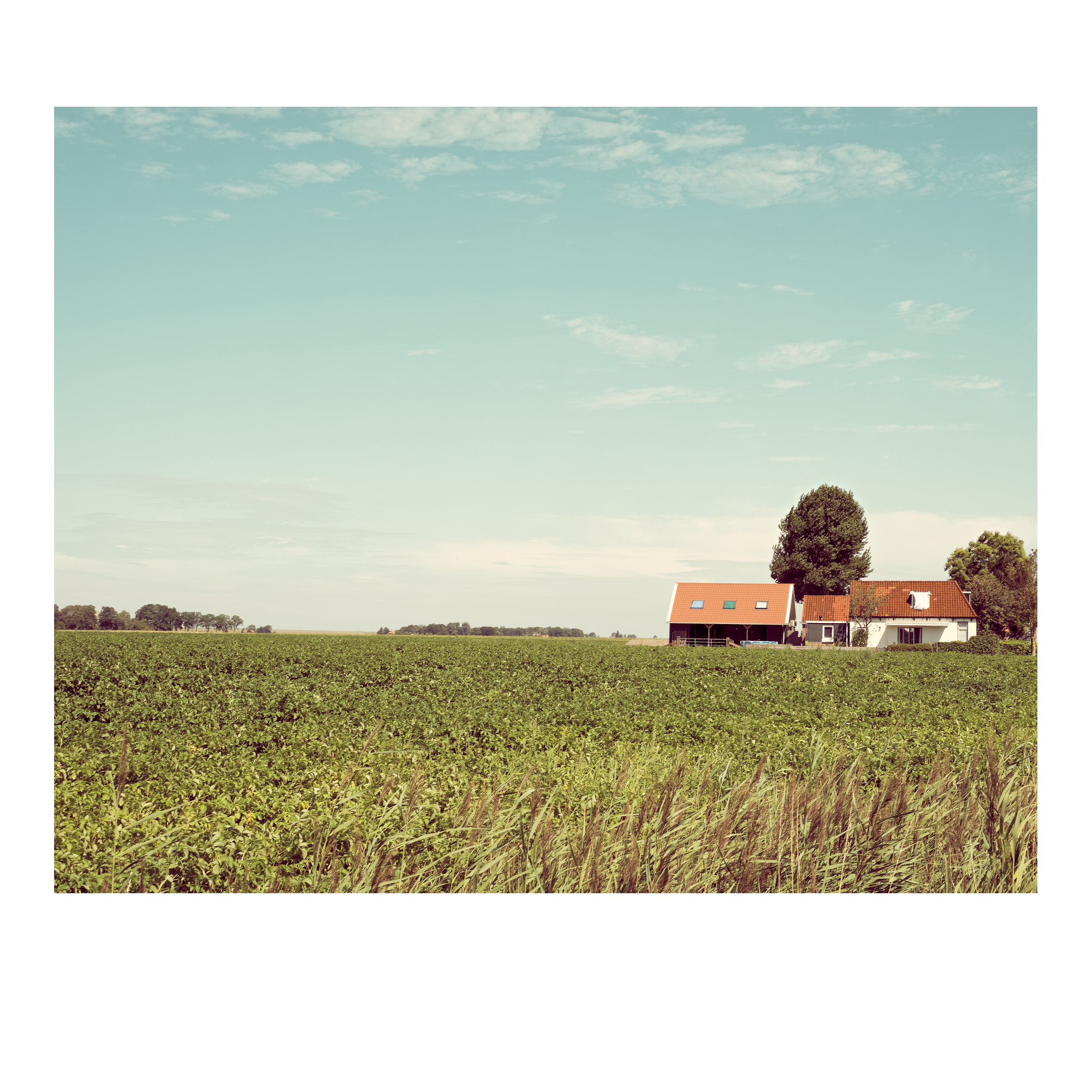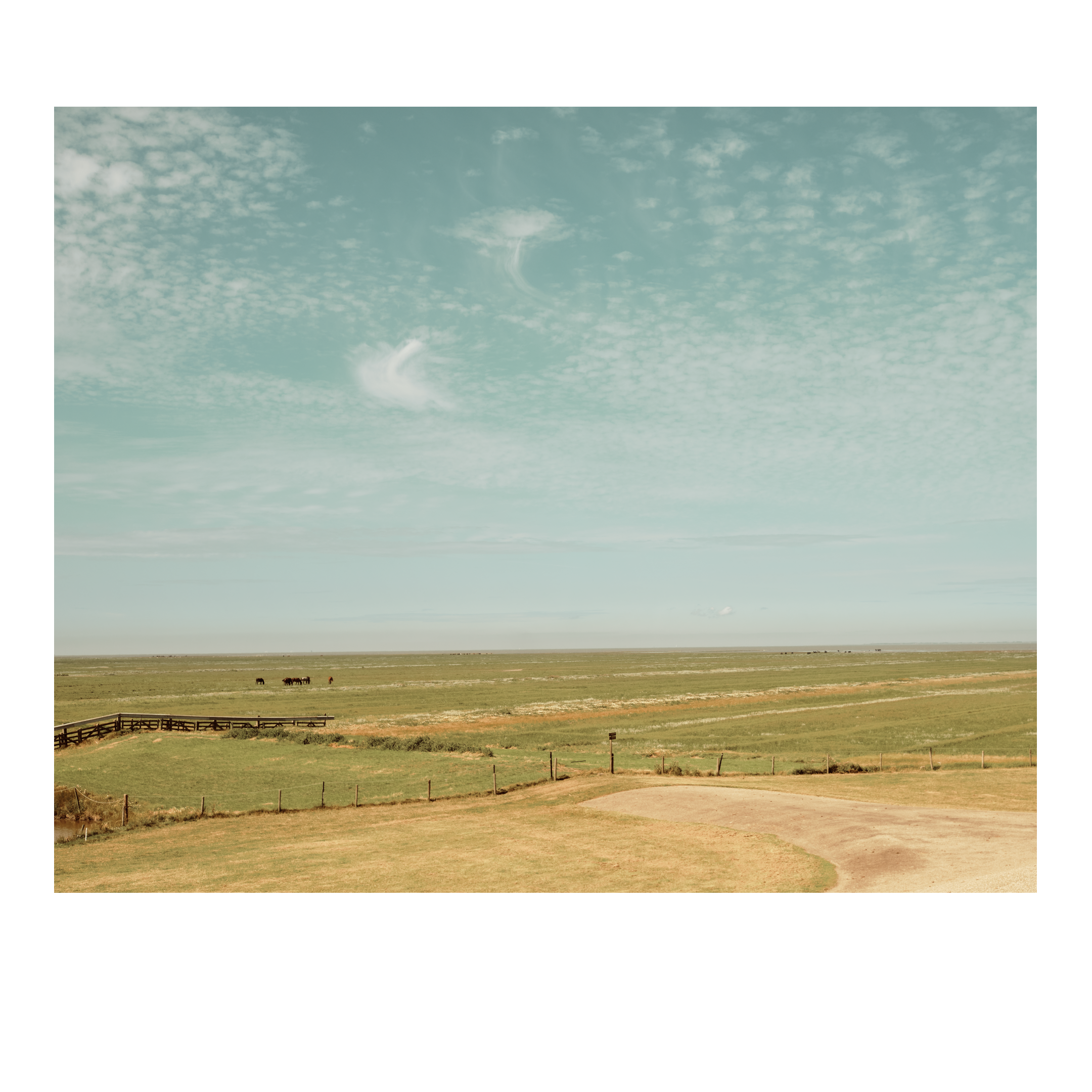 Uitzicht vanaf een dijk over een weiland met grazende paarden, nog verder weg in de verte ligt de zee en de Waddeneilanden. Lege rijen in een geoogst veld. Een veld met graan in de zomer, een boom in de verte, in de randstad kennen we deze leegte niet.