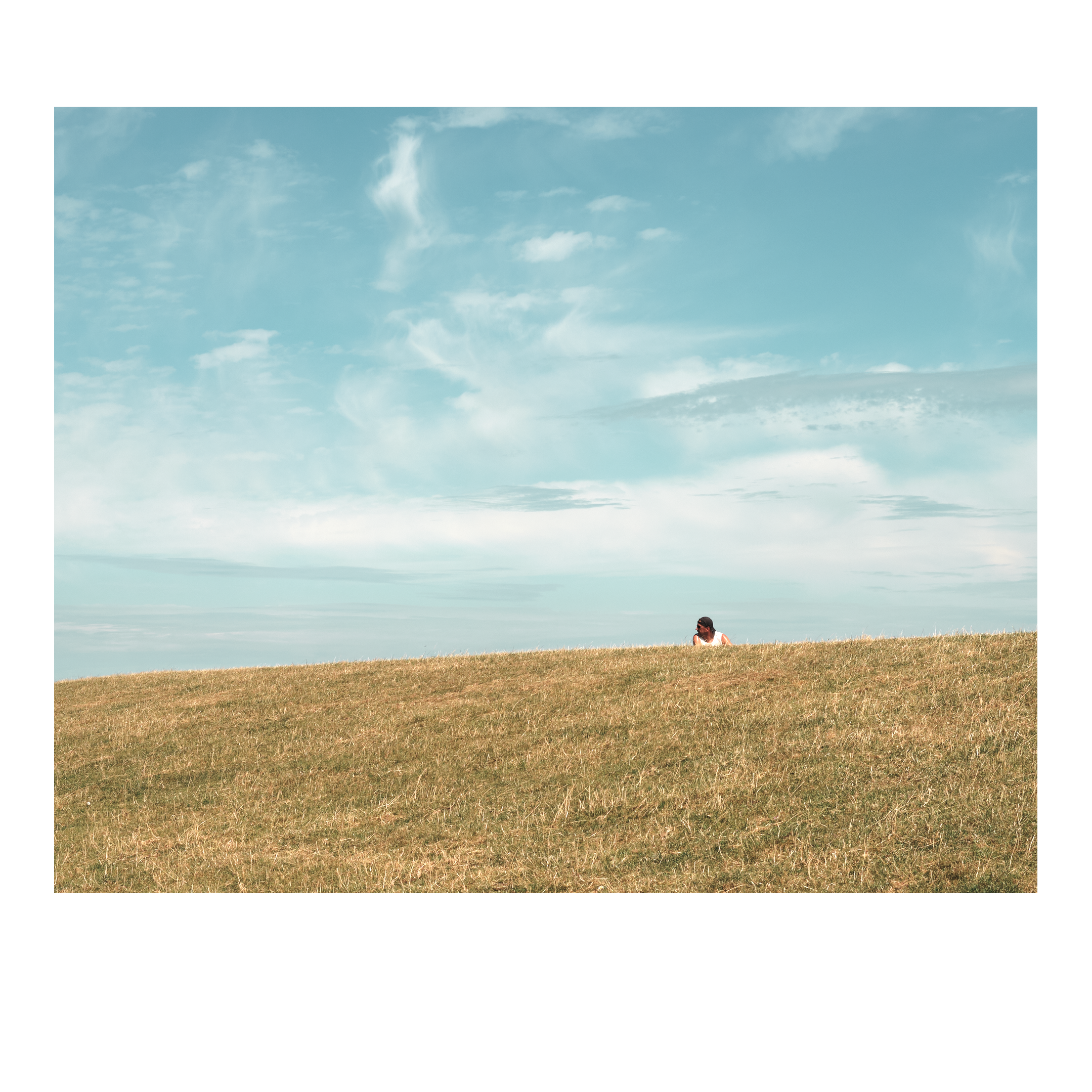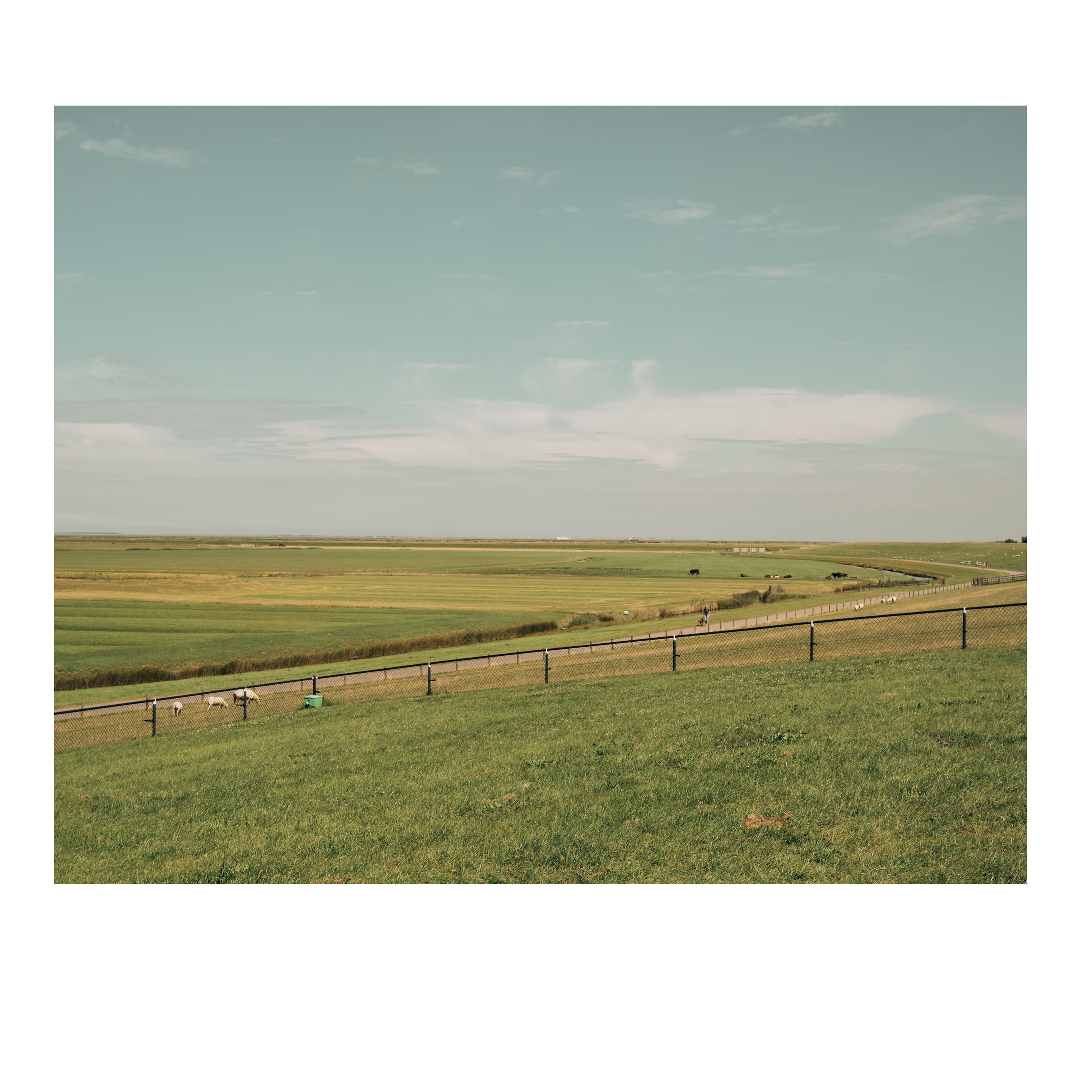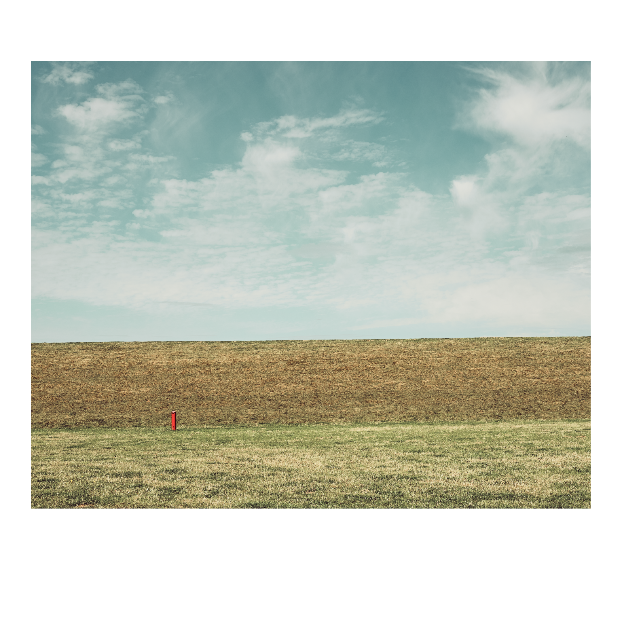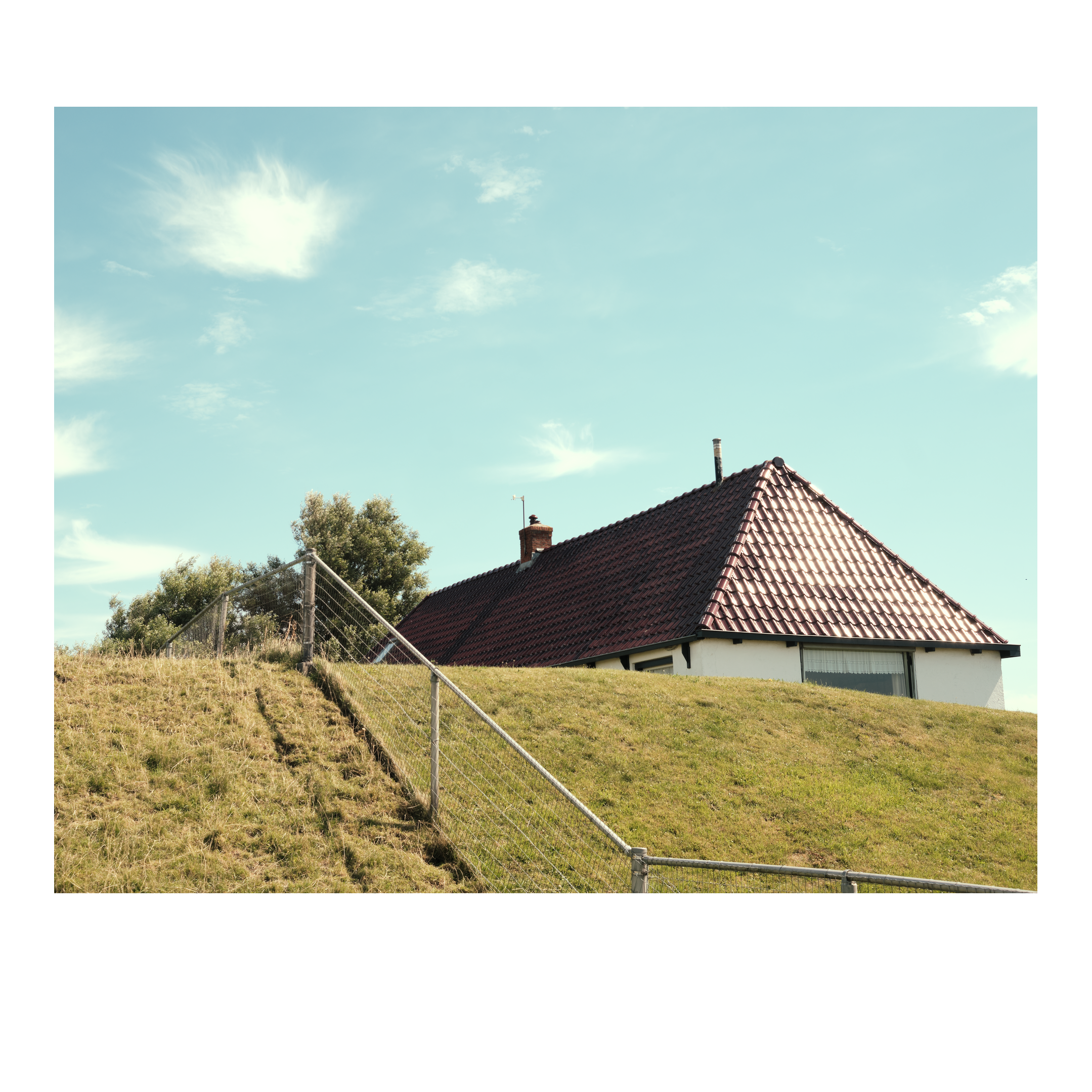 Het was een winderige dag, de molens in het veld draaiden in rap tempo. Eenzame dijken beschermen ons tegen de zee. Achter de dijk is een rood dak te zien, een rode paal met niets eromheen. Vanaf de dijk zie je in de verte de Waddeneilanden liggen.